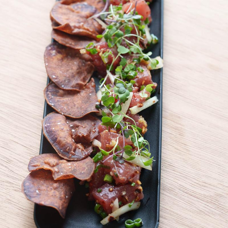 Crispy panko-fried ahi tuna, sliced and served with house katsu dipping sauce.