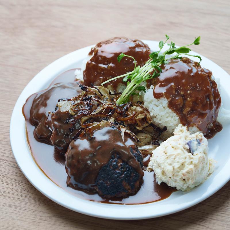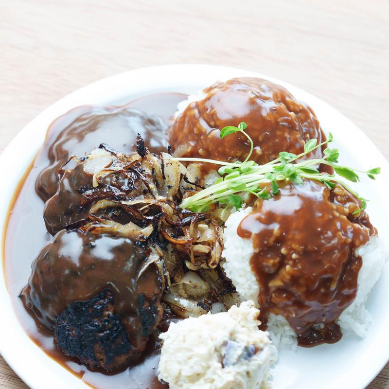 Hamburger patty over rice, topped with gravy and a fried egg.